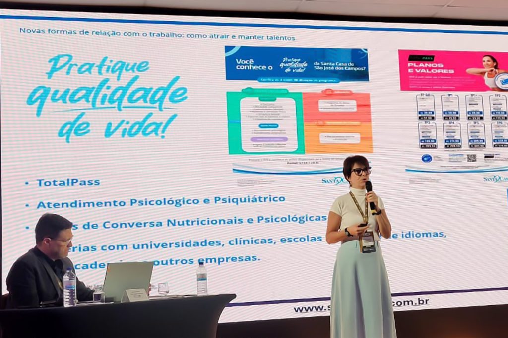 Hoje, 17 de outubro, a gerente executiva de RH da Santa Casa de São José dos Campos, Márcia Antunes, subiu ao palco do 9º CONSINDHOSFIL para compartilhar sua expertise em gestão de pessoas.